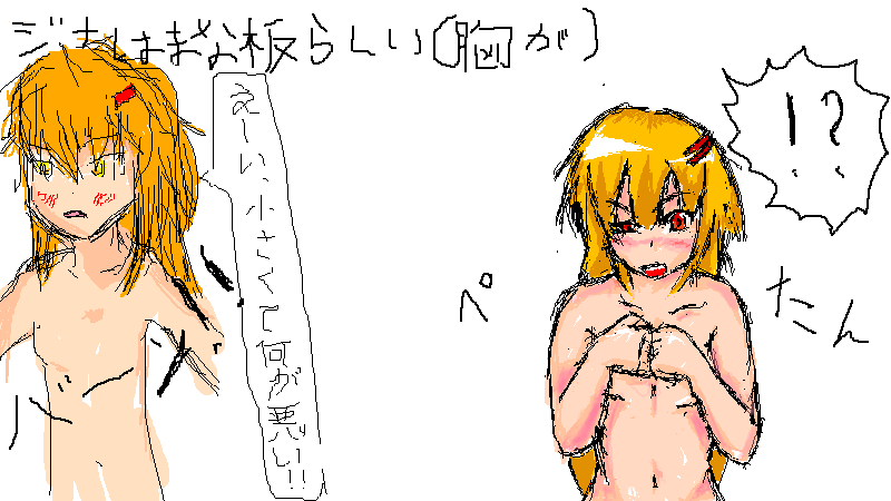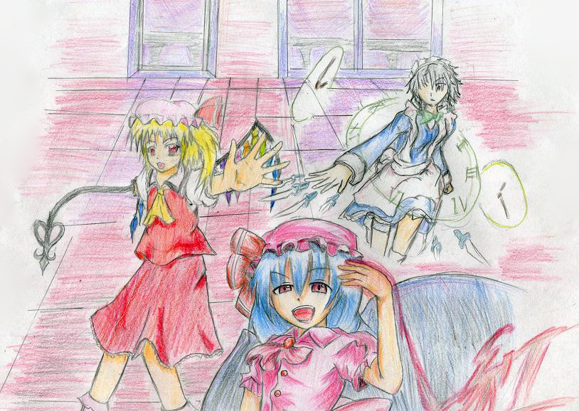ダメッ、そんなに強くしたらゼラチン玉です。 テスト期間中ということで、思ったより絵が描けずにイライラ。学校サボって描いちゃるかと本気で考えていたら本当に体調崩しました。病は気から、これほどリアルで体感できる諺はないですねーw さて、結構前から計画が進行していたのですが、とうとう完成しました!! 何が?そう、複数人でのお絵かきです!!夢だったんだ!! のほほん様(リンク「のほほんのホームページ」管理人。モバゲータウンに登録している方は「Leabra」様で探してみてください)、ラグナ様(友人。モバゲータウンに登録している方は「式の式の式」様で探してみてください)のご協力のもと、紅魔館メンバーを描かせていただきました!! 私の「みんなで東方描こうぜ!!描け!!」という無茶に応えてくださったお二方、本当にありがとうございます!! 公平なジャンケンの審判により、のほほん様、ラグナ様、私の順で描きたいキャラを決めることに。 のほほん 「咲夜がイイな。一回描いたことあるし」 のほほん …咲夜さんに決定。とられたーw ラグナ 「じゃあフランちゃん。おぜうは…目立つでしょ?」 ラグナ …妹様に決定。目立つからって、お前…w で、消去法でおぜう様に。 ま、妹様よりは描きやすいからイイか。 のほほん 「え、背景はお前だろJK」 私 「俺っすか」 背景も私に。マジでか。 左 フランドール ラグナ 中心 レミリア 私 右 咲夜 のほほん …まあ、キャラの配置決めたの、のほほん様だし(ぷいっ) 正面のキャラが目立ってしまうのは、仕方がないことだよね?(ぷぷいっ) それにしても、背景の色が全てを駄目にしてしまっている気がする。やっぱ、私ごときに任せちゃったのは間違いとしかorz とにかく、お二人ともありがとうございました!! ご迷惑おかけして、本当に申し訳ないです!! さてと、勉強なんとかせな。化学がー。数学がー。あー。