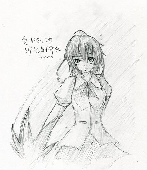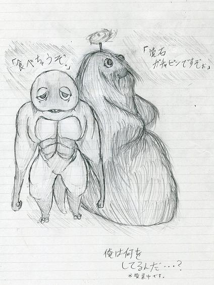 美しく。誇り高く。ゼラチン玉が甦る。 どうも、趣味の多様化が著しいゼラチン玉です。でも基本ヲタ趣味。 女の子だから可愛いわけじゃなくて、可愛いから女の子だから可愛くない女の子はなんなのさ? と、なんとも意味が分かりませんが、要するにこう言いたいわけです。 「女の子が描けないよぅ。」 マンネリが…え~と、何日目だ?もうテストも近いし、いい加減治ってくれないと絵を描くチャンスが無くなってしまいそうで怖いです。 ミクの出来が不満だったのでカラー絵を一枚でも仕上げたい… ですが、果たして描ける日が来るのかな!?水曜日は化学(苦手科目)の小テスト!!描ける日が来るのかな!? とりあえず、学校での落書きをば。 エヴァ・破が公開され、我が高校ではエヴァブームが到来中です。うん、ロボに憧れてこその男の子だもんね。 だから真・ゲッター描いてみた。 う~んとね、何人の人間を敵に回すかも分からない発言だけれど 俺エヴァ嫌いやねん(爆) 目のエフェクトに若干力が入ってますが、全体としては一時間とかかっていない落書き。 私 「ガチャピンって、どんなんだっけ?」 友人「え~と、垂れ目で、前歯出てて、丸っこい恐竜」 私 「それだけかよ」 友人「あとはまあ…食べちゃうぞかな?」 なんて言われたもんだから、こうなりました。 描いてたのは授業中。バレなくて良かったと心底思う一枚。 ちなみに、ムックの方が時間かかった。 ガチャピンの拳で貫けないものなど、ありません。 最近射命丸への愛が強すぎる私。 いや、惚気ではなく。ただ、私は映姫様やパルスィも好きだということを憶えている方が何人いるだろうか?描いてないもんなぁ。 だってエーキ様もパルパルも、服のデザイン面倒く(ry 描こうかなぁ。描けるかなぁ… | プロフィール