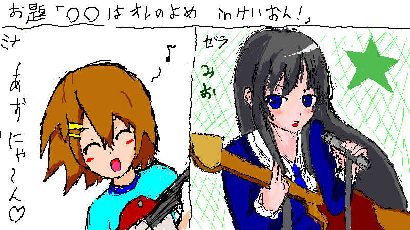 お久しぶりです、ゼラチン玉です。 ここのところ忙しくて、なかなか更新できませんでした。申し訳ないです… 部誌の仕事は、結局課題などで手が回らなかったり、家族の反発、作品のマンネリ化などの理由により、小説の方は諦めさせていただきました。 この件により迷惑をおかけした部活の方々に、深く謝罪を申し上げます。 一応イラストは仕上げて提出します。万が一我が部の部誌を手に取ることがあれば、そちらをご覧いただければ幸いです。 ページ穴埋めにイラストをもう一枚描こうかな、とも思っているんですが、それも時間が余り次第ですね… ていうか、この時期課題多すぎて泣きそうですorz とりあえず、もちろんのこと絵は描いてないので。 代わりと言ってはなんですがエチャログ放出~。ネタに困ったとき、絵チャログって便利。 こんな綺麗な絵が私の絵なわけないでしょうが。 日曜日、ミナト様が絵チャにお邪魔してくださったらしく、それを知って私が行くまでになんと完成させてしまったというもの。 .hackの志乃というキャラだそうです~。 今さっきまで、ミナト様と絵チャやってましたw忙しいとはよく言ったものだなおい。 ちなみに、左がミナト様で右が私。 お題は「けいおんの好きなキャラ」。 好きなキャラっていうか、私この子しか知らんのよ。 深夜アニメは私の体力的に厳しいものがあります… 録り溜めて積むのも嫌ですし。 それにしても汚いな私の絵w ミナト様の繊細なタッチを真似したいものです。 今週には多少暇ができますから、上手くいけば土日には絵を一枚アップできると思います。 その前に、もしかしたら部誌のイラストをアップ出来るかもしれませんね。それでは ノシ | プロフィール