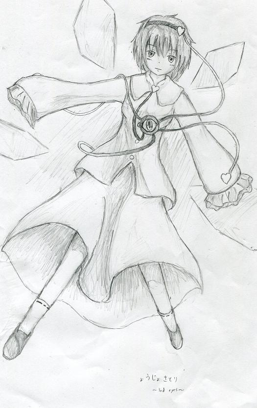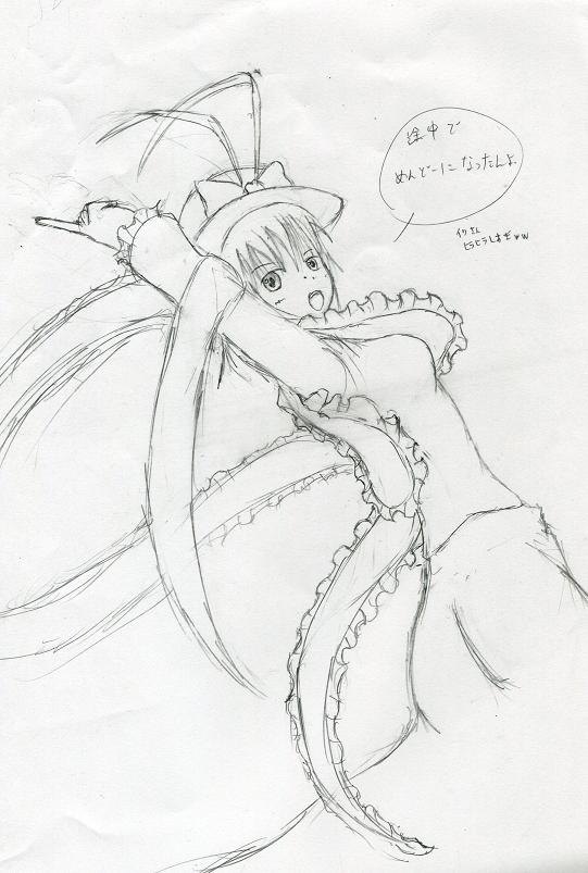 スキャナどこやった!? あんなでかい物をなくせるんだから、あたいってば西京ね。西陣玉です。 いや、西京と西陣織関係ないけどな。雰囲気似てたから言ってみたかったんです。 もうかなり前にリク受けたさとりんが、実はかなり前に鉛筆画仕上がってるんです。部誌の作業が終わるよりも前に。 でも、スキャナをどこにしまったんだか分からなくなるアホっぷりで、鉛筆画のまま放置してあるという始末だったり。 なんであんなでかいもの、なくしたんでしょうかね…? なんて思ってたら、兄の部屋にありました。 い、いつの間に……!? ともあれ、これで絵が取り込める!! で、部誌のsomeone(自己紹介ページ)の提出日は明日なわけで。 も、もうさとりん間に合わねえじゃん!! とりあえず、前描いた天子でも提出しましょ。それなりにいい出来ですし。 さて、スキャナも帰ってきたので、授業中に描きためていた落書きでもアップしましょう!! ただ、中には結構放置されていたものもあるため(ほとんど1週間以上は放置している)、保存状態は最悪ですがご了承ください。 私のカバンの中、夢の島級デスヨ? すずぬーと様の「激突要塞」っていうフラッシュゲーム、知ってますかね? その新作に出てくる「忍玉」の擬人化。所要時間?見りゃわかんだろ、30分足らずさ。手抜き乙。 くのいちって、萌えるよな。 駄目だ俺の絵じゃくのいちの素晴らしさが伝わらない。 特撮大好きな某友人と、企画でウルトラマンの小説を書かせていただいているのですが、その小説に登場予定の怪獣。 ちなみに、怪獣およびストーリー原案が友人、本文と挿絵は私が書かせて頂いております。いつかお見せできたら…いや、無いかな。 ちなみに友人曰く、デザインコンセプトは「四足歩行の昆虫型怪獣」。 元のデザインはバッタ系でしたが、気付けばカマキリチックに。でも友人から「可」が出たのでおk。 友人がラグナ様(結構前までコメントしてくださっていた方)にデザインを頼み、そのデザインに私が手を加えたもの。 友人曰く、「爬虫類系」。で、大型ではなく等身大戦用。 爬虫類って、面倒ですよね。 ちなみに両怪獣とも一時間かかって無かった気がしますが、いまいち憶えてない。 じゃーん。 筋肉が描きたかった。 一見デッサンの練習に見えますが、どっこいただ単に胸筋~腹筋が描きたかっただけ。 だから手足…ていうか、四肢は結構適当。 何気に、顔の影には気を遣っています。この影を描くために、授業中必死にご教授してくださっていた先生の顔を凝視しましたよ。授業そっちのけで。 やっぱり手を抜いちゃうから、ゼラチン玉は困ったもんだ。 イクサン。さとりんと同時期にリク受けた気がして描いたんだけど、服のデザインが思い出せなくて諦めました。 ていうか、東方キャラの服って記憶しづらいですね。いまだに憶えていないキャラがいます。依玖は筆頭。 え~と、デザイン確認したらまた描きますので、⑨なヴェネスト様、しばしお待ちを。 …あれ、ハサ様だっけか?駄目だ憶えてない。殺していいですよ。 hukumo様より、さとりんのリクがあったので。 手は抜いていません。全力です。 ただ、デザインはうろ覚えです(爆) まあデッサンの修正やらデザインの見直しをして、色を塗り次第またアップします。構図は気に入っているので。 なんで鉛筆画の段階でアップしたかというと、塗るのがいつになるか分からなくなってきたから。hukumo様、申し訳ございません。 キングゲイナー5話まで視聴。あと21話。2クールあったんだ、結構長い。 そして、そろそろカラオケ欠乏症に。う、歌いたーい。 「そろそろ」って、もうかなり歌っているんですけどねw 私の場合、時間がたつと歌いたくなるわけではなく、新しい曲を憶えると歌いたくなる。「キングゲイナー・オーバー!」、「HEATS」、「バトルクライ」、「メーデー」、「ブラック★ロックシューター」etc… 今更な曲ばかりなのは、気にしない。 さってと、課題やらないと。もっと早くやれよ。それでは ノシ