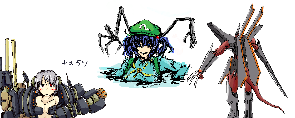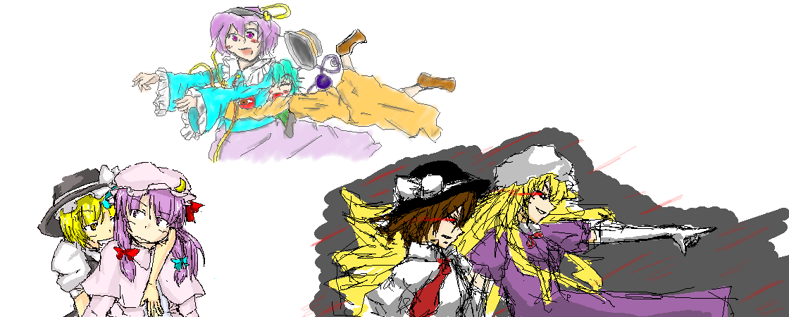 久々にエチャやりました~ というわけでログ晒し。えいっ! お題「機械+α」 左下 私 名づけて「プラスアルファたん」。 +αの意味が良く分からなかったから、とりあえず機械とおにゃのこ混ぜたら最強じゃね? と思って描きました。あながち間違いでも無かったようで。 機械つっても、随分旧世代的というか、蒸気機関っぽくなっちゃいました。 中心 はくろう。さん のびぃぃーるアアァーム。相も変わらずカリスマです。久しぶりのはくろう。氏はやはりカリスマです。 てなわけで、にとり。水面の影の入れ方とか、顔の影の入れ方とか、こだわり過ぎだと思うの。 というわけで「どうやって描いてんの?」と聞いたところ、「てけとーです」とのこと。馬鹿なw 右 yearさん 機械竜?リザード系のデザインに見えます。 背部の大型スタビだかブースターだか、これだけ派手なのであれば、大層かっ跳べることでしょう。大きいは格好良いである。これブースターの常ね。 きっと戦闘スタイル的には、瞬間的なターボで相手との距離を詰めつつ、右手のクロウで装甲を削り、隙あらば左手のブレードでザックリと刻んでやるのでしょう。格好良いね。接近戦は浪漫だね。 良く見ると、何気に筋骨隆々。 2回戦。そろそろ4時にもなろうかという時間。 左下 私 お題「パチュリー」。せっかく(?)なので「パチュマリ」。 魔理沙の左腕が異次元になってるなぁ、と今さら思ったり。パチュリ-描いてるとき、アタリ消しちゃったんだw 私の中のパチュマリは、パチュリーが好きで好きで仕方ないけど、素直になれずつい苛めたくなっちゃう魔理沙と、それをウザったいと煙たがりつつも、内心はそのちょっかいすら嬉しくてたまらない、魔理沙大好きのパチュリー。 パチュリーがあんまりツレないから、嫌われてるんじゃないかとハラハラしてる魔理沙が可愛いのです。 真ん中 gemaouさん がばんちょ。 お題「さとこい」。私がパチュマリなんて言い出したから、みんなカップリングになったよ!!ごめんね!! 水平ロケット抱きつきは妹キャラの特権であり必殺技。 こいし「お姉ちゃん、好きー!!」 さとり「まったくもう…」 王道ながらに真理でございます。 それにしても、絵チャで淡い塗り(水彩?)とは、高度な芸当をやってのけてくれます… 右 はくろう。さん 秘封倶楽部のお二人です。 目に浮かぶ光が、なんとも言えずよろしゅうございます。相変わらず演出も格好良いのう。 私、実はこの二人をよく知らないんだけれど。マエリベリーは見れば見るほどゆかりんに見えるね。 というわけで、皆様お疲れ様でした~ 久しぶりということもあって、とても楽しませていただきました。 機会があれば、またよろしくお願いします!